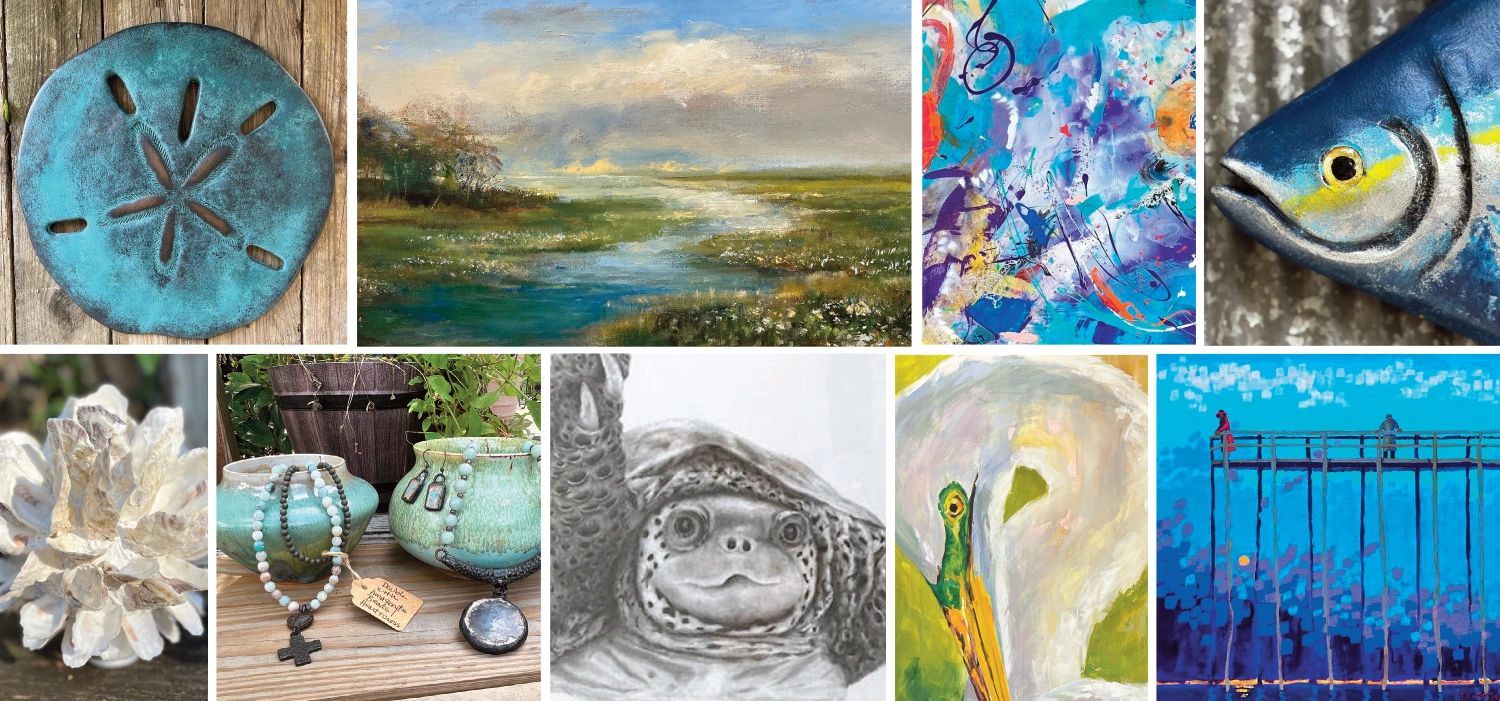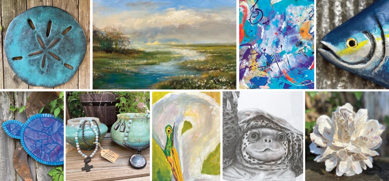 In addition to the acrylic, oil and watercolor paintings you’ll find lovely blown and fused glass, unique clay and sculpture made from found objects, wonderful copper "spinners," fish, turtles, birds and other fun garden art.